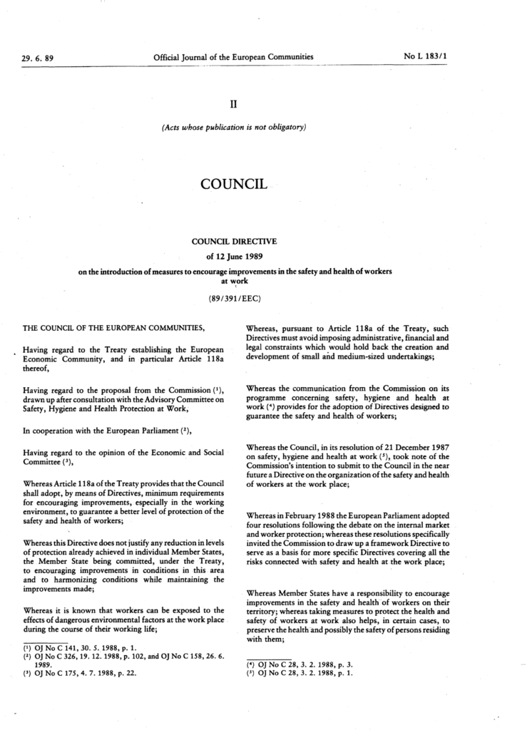 Directive 1: EU COUNCIL Directive 89.391.EEC