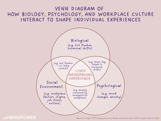 Applied to menopause, it helps explain why no two experiences are the same. Hormonal shifts (biological), emotional symptoms like anxiety or brain fog (psychological), and workplace culture, stigma, or lack of flexibility (social) all contribute to how menopause is experienced, and how well someone is supported.