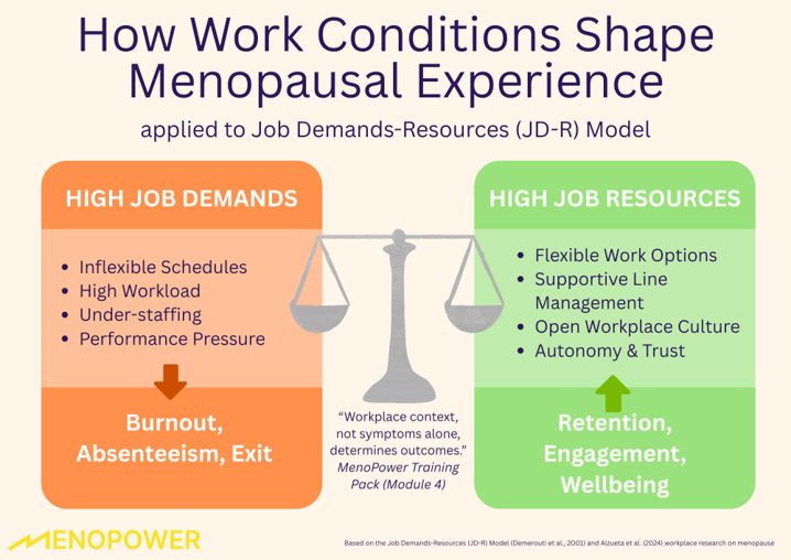 In contrast, job resources, such as autonomy, support from managers, and role clarity, can buffer the impact of high demands, boost motivation, and support retention. The JD-R framework highlights that menopause support must go beyond symptoms and focus on job design and organisational conditions.