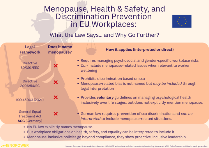 - Example: Germany’s Equal Treatment Act (AGG): Requires employers to prevent sex-based discrimination. The underlying principle can reasonably be inferred to apply to menopause, even though it is not named explicitly.